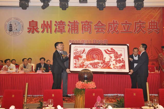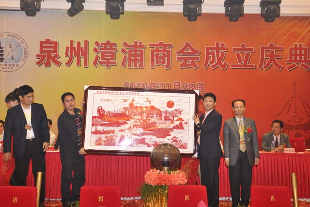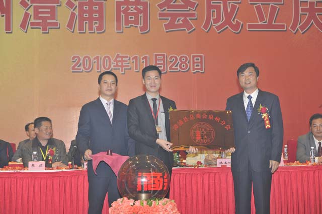 庆典仪式上,县领导向商会进行授牌、授印并赠送贺匾。6个异地漳浦商会负责人到会祝贺,南靖、云霄等其他驻泉异地兄弟商会送来了贺 信贺礼,香港漳州同乡总会等送来了贺礼和发来贺电。