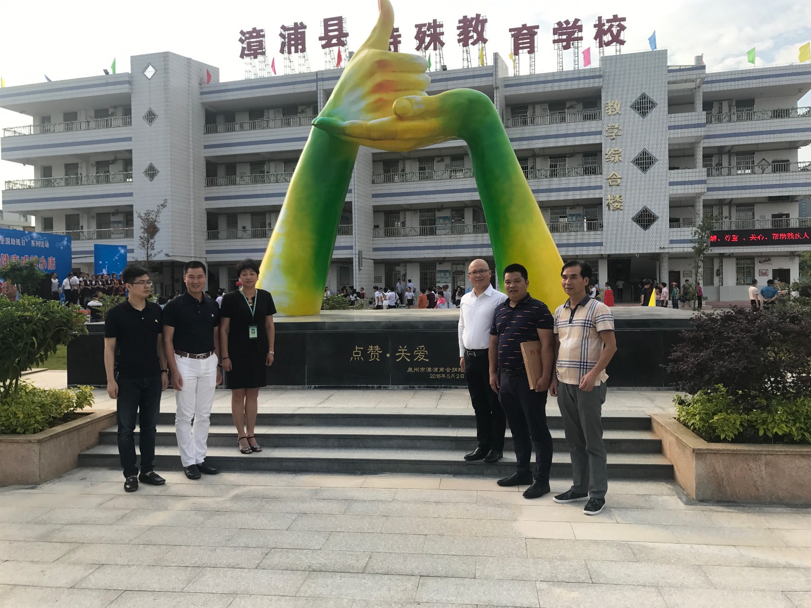 我们商会曾经在2013年1月21日,时任会长陈忠辉领队,把年会拍卖书画、剪纸作品款7.68万元捐助漳浦县培智学校。学校2016年5月在新校区操场塑造以本会捐赠“点赞•关爱”的哑语手势像。今天,李丽娇校长在塑像前和大家一起留影,感到特别亲切。