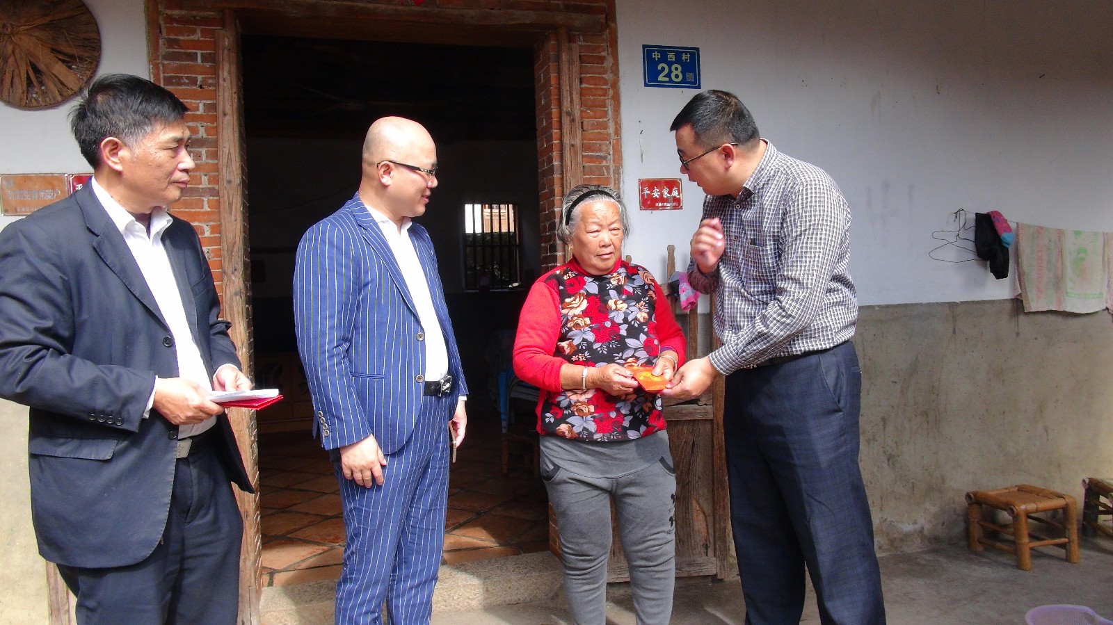 值班会长张汉辉(左2)带队走访慰问贫困户,发给扶助金
