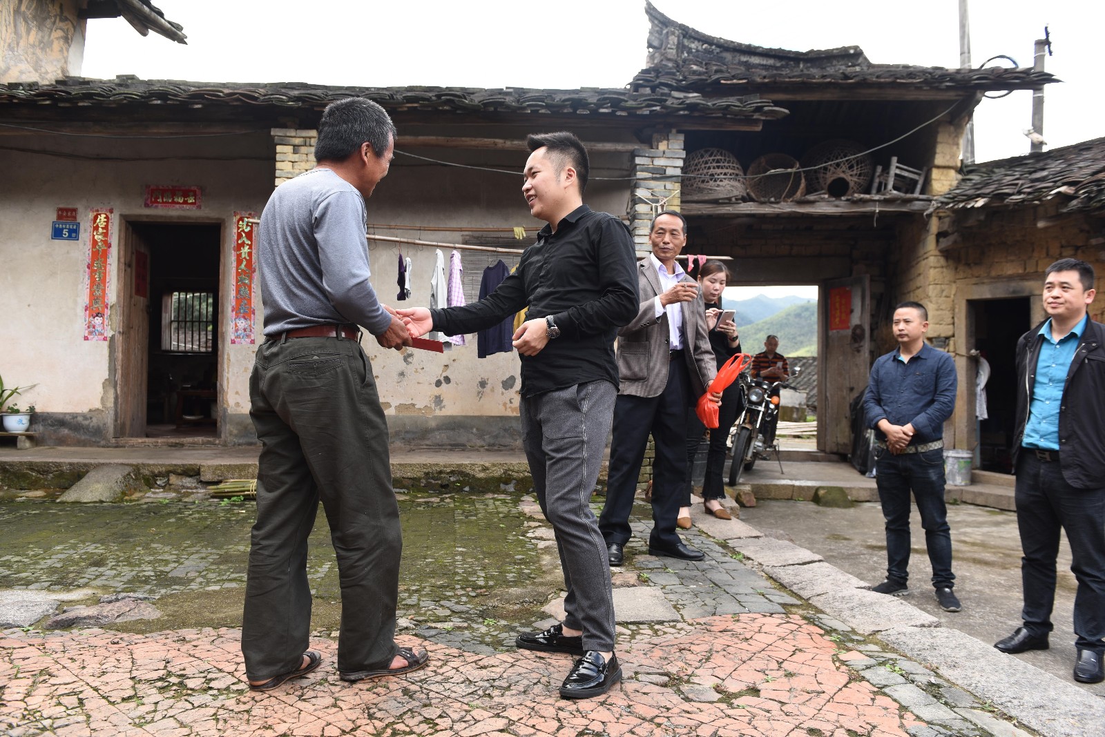 南浦乡党委书记张晓龙(图右1)参与走访慰问贫困户,发给扶助金
