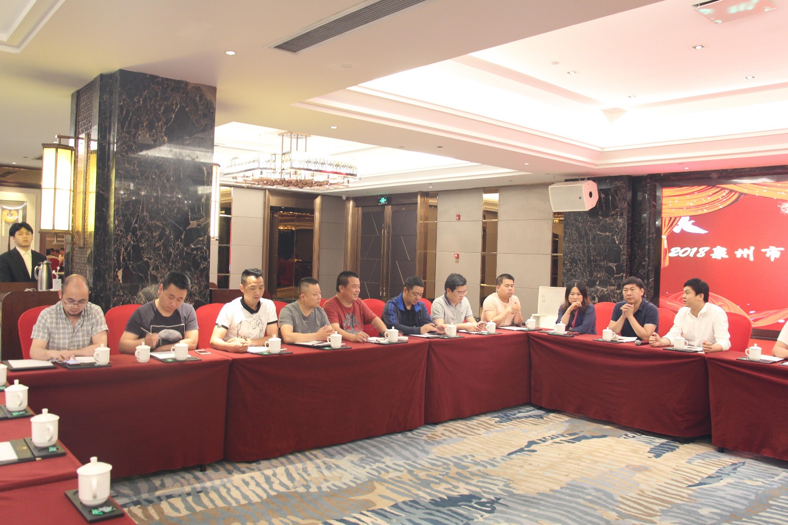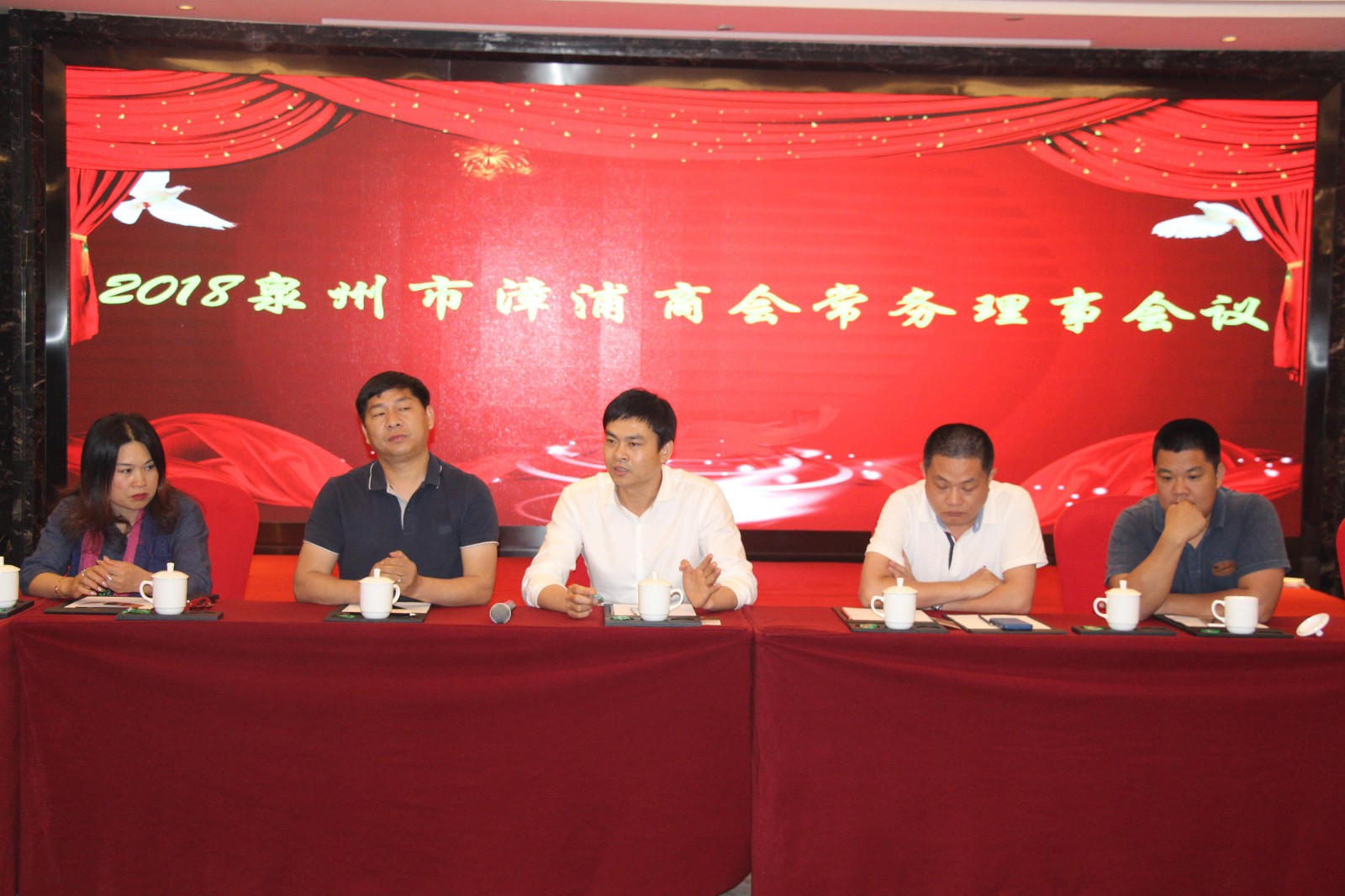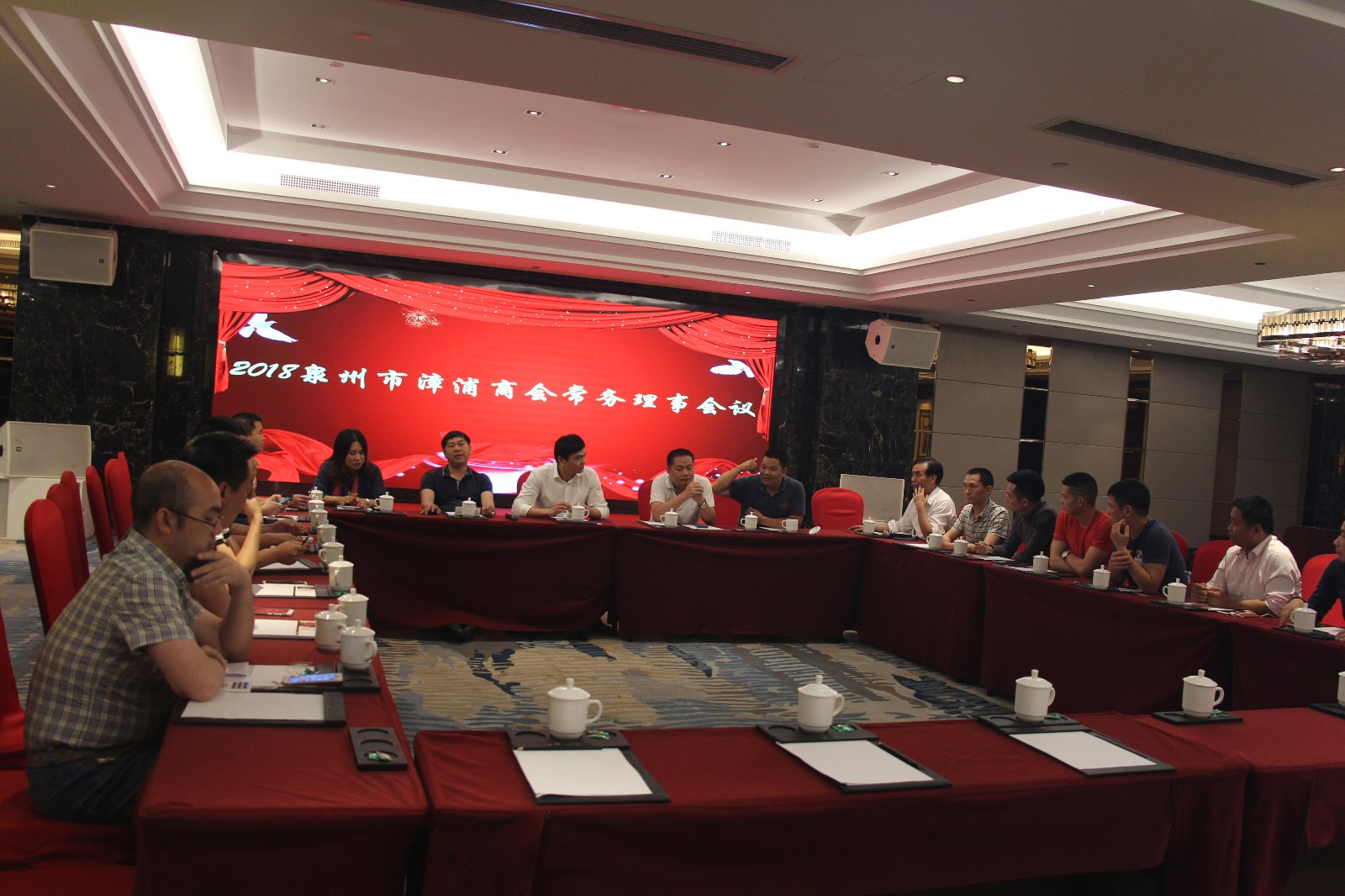 4月11日晚,泉州市漳浦商会在晋江爱乐国际酒店召开常务理事会议。 参加会议的有21名常务理事会成员,李佳添会长主持会议,常务副会长陈瑞章、洪栋梁(兼秘书长)、何伟智出席会议。