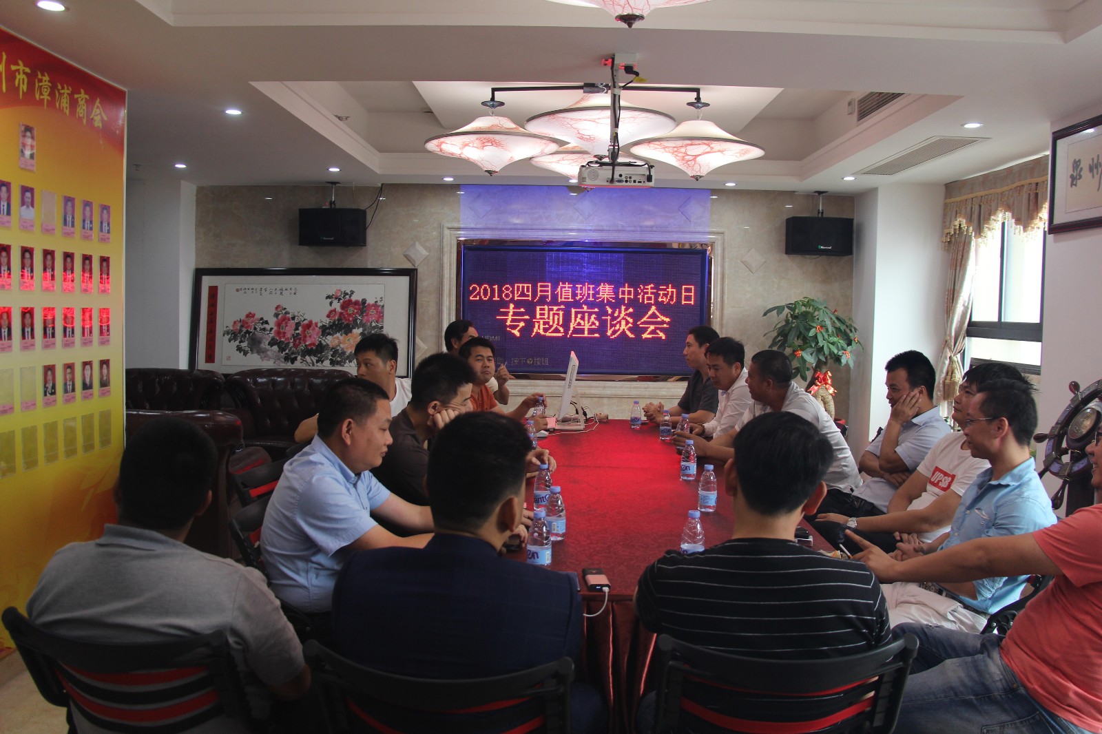 27日下午,泉州市漳浦商会四月份值班组,利用集中活动日举行专题座谈会。值班会长张汉辉、何伟智对活动日事先进行筹划,并带头参加。到会的有值班副会长刘加章、李龙印、杨锦坛、林加炎,值班组成员常务理事卢江文、林辉煌,理事刘福建、李瑞宾、杨友城、杨惠章、陈文奇、陈龙江、陈振坤、林志强。常务副会长、秘书长洪栋梁、秘书处黄诗舰、陈素卿也参加会议。