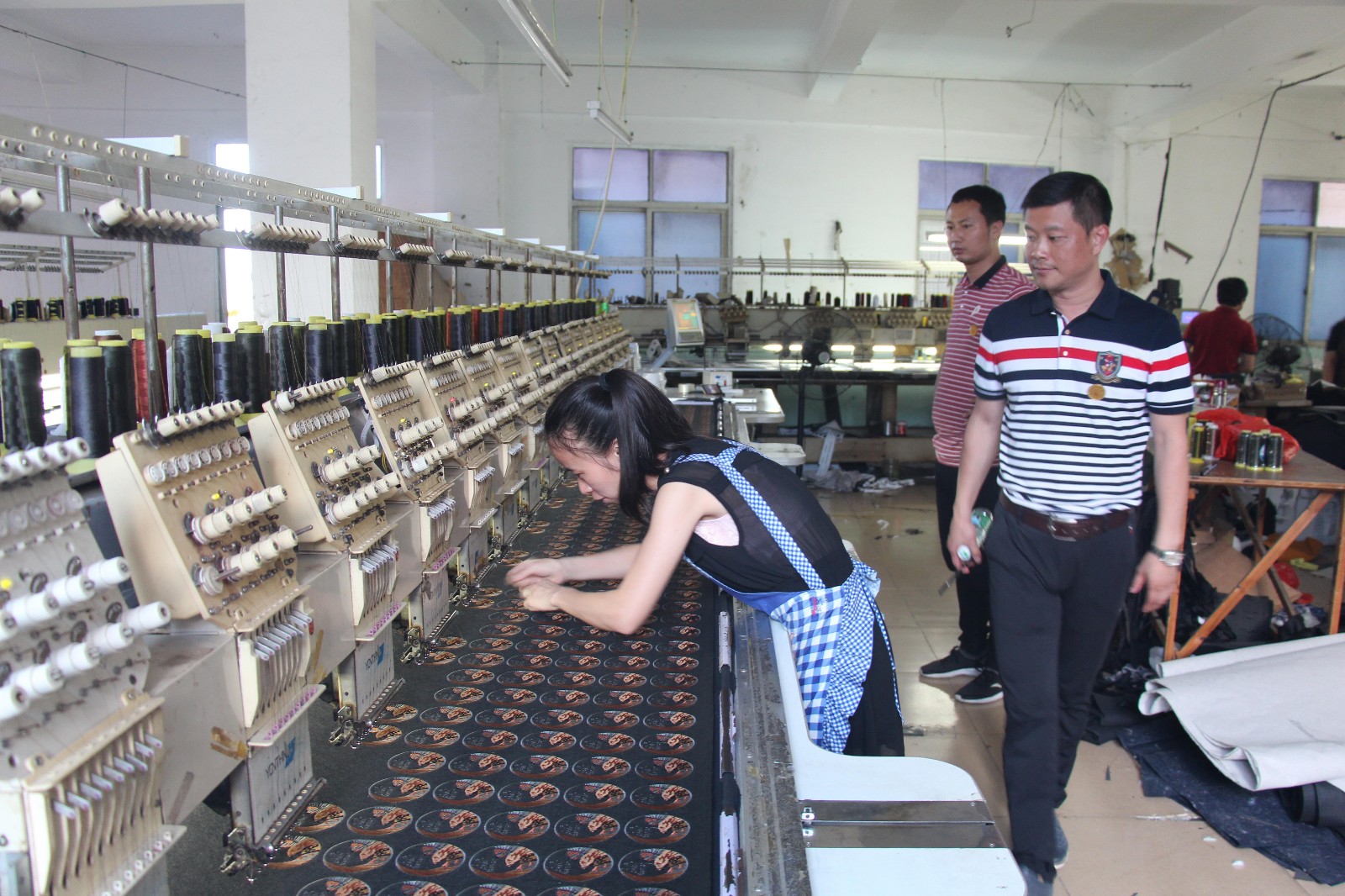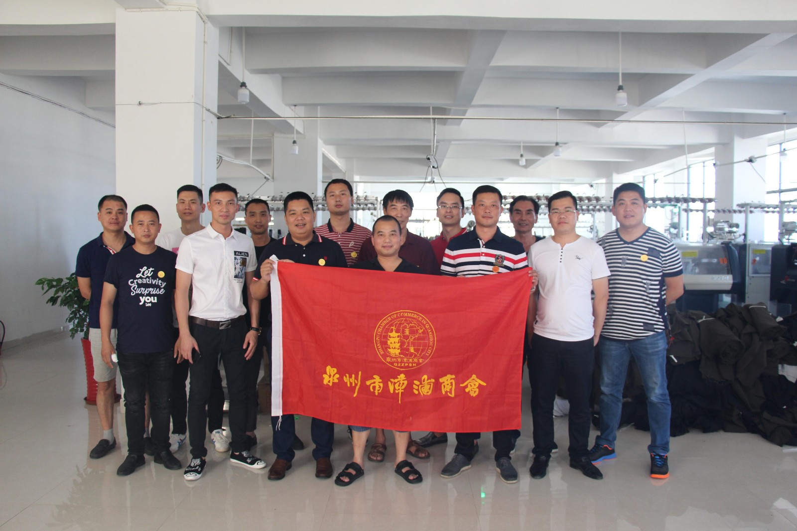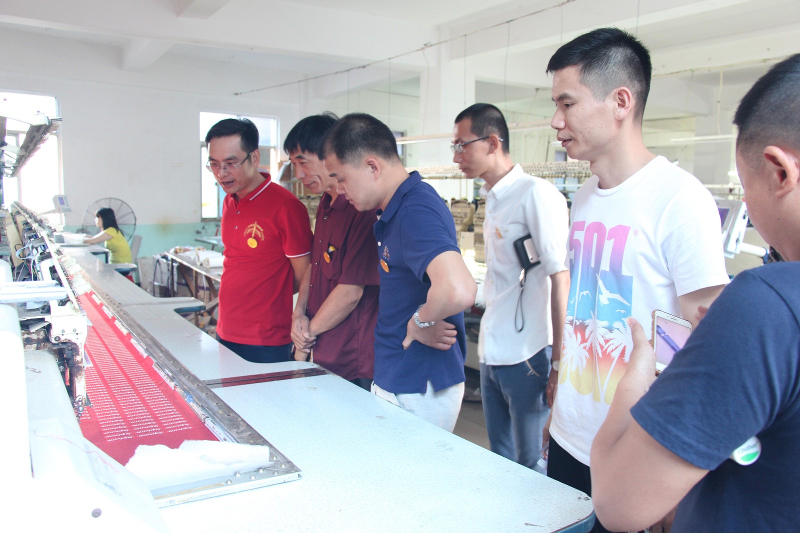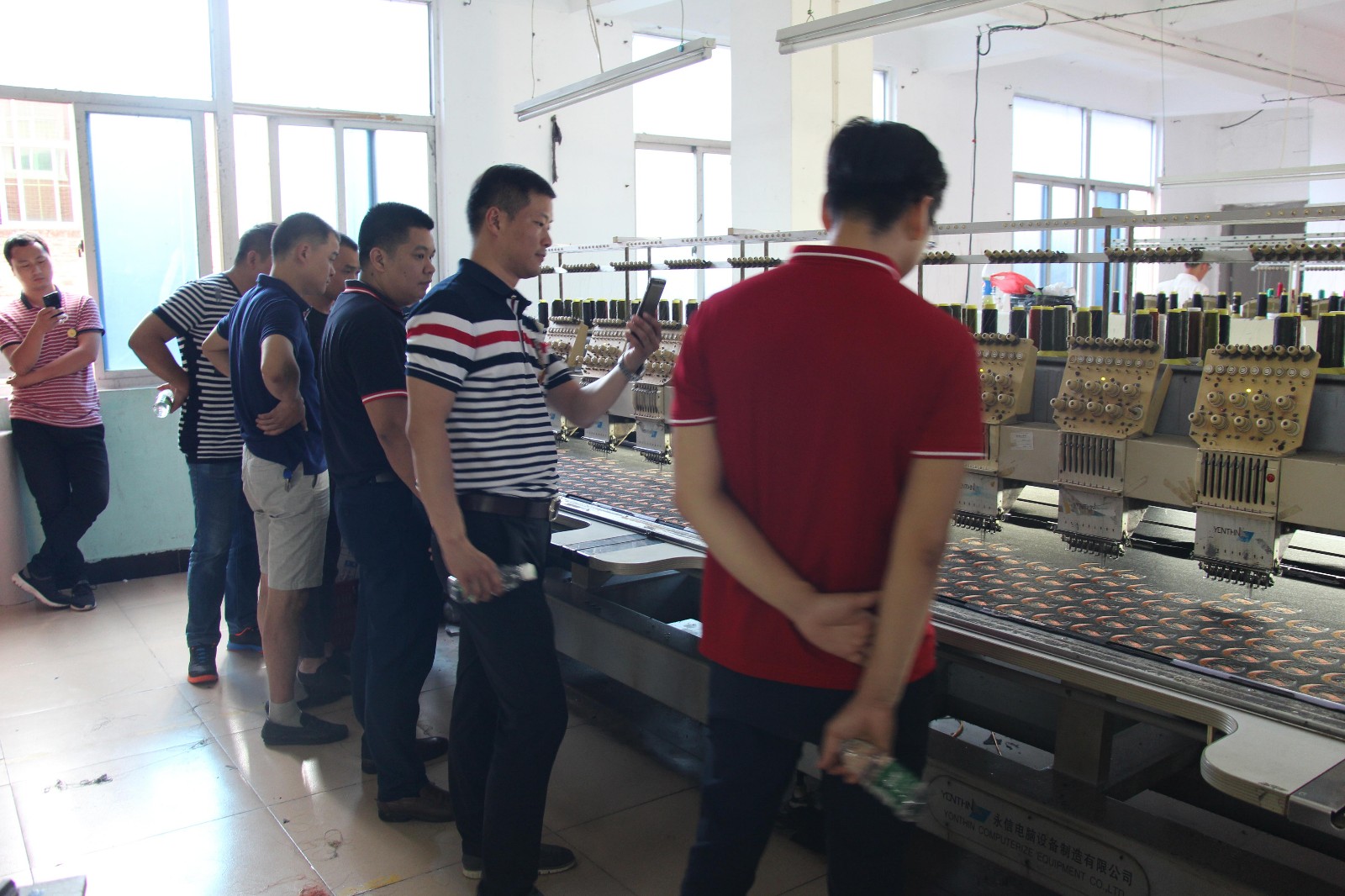 到石狮灵秀镇彭田街溪东3区走访陈春明的美极客鑫瑞发绣花厂,常务副会长林汉添(图右2)饶有兴趣的拍照