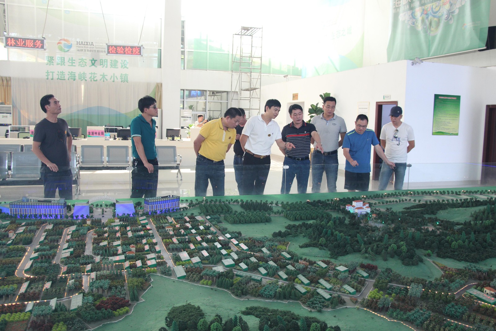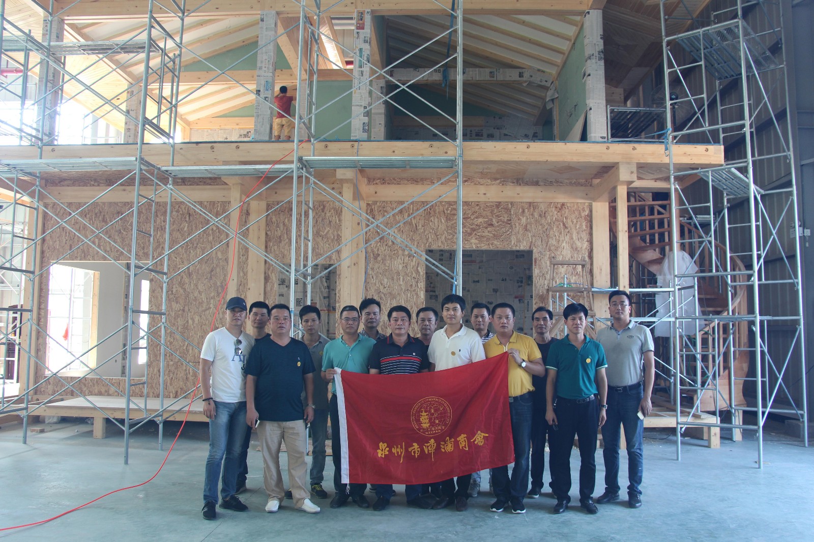 在木屋样品房前留影陈湘海书记(左4)李佳添会长(左5)、蔡炳煌镇人大主席(右1)