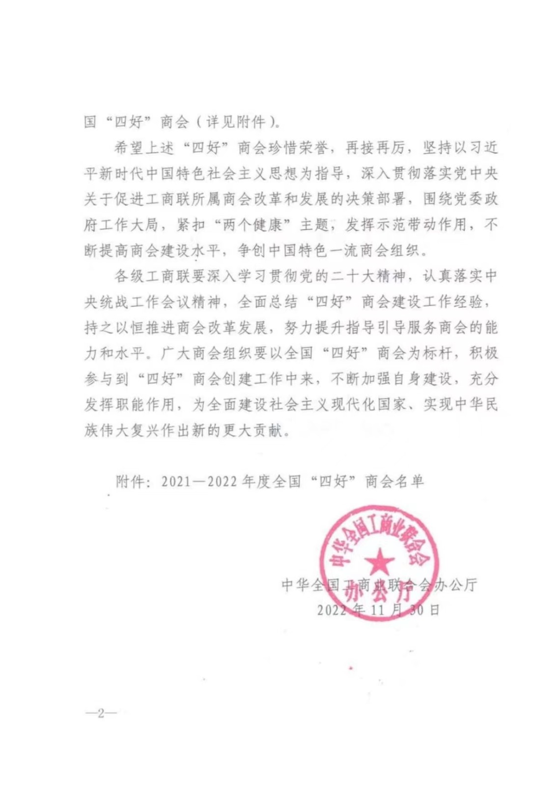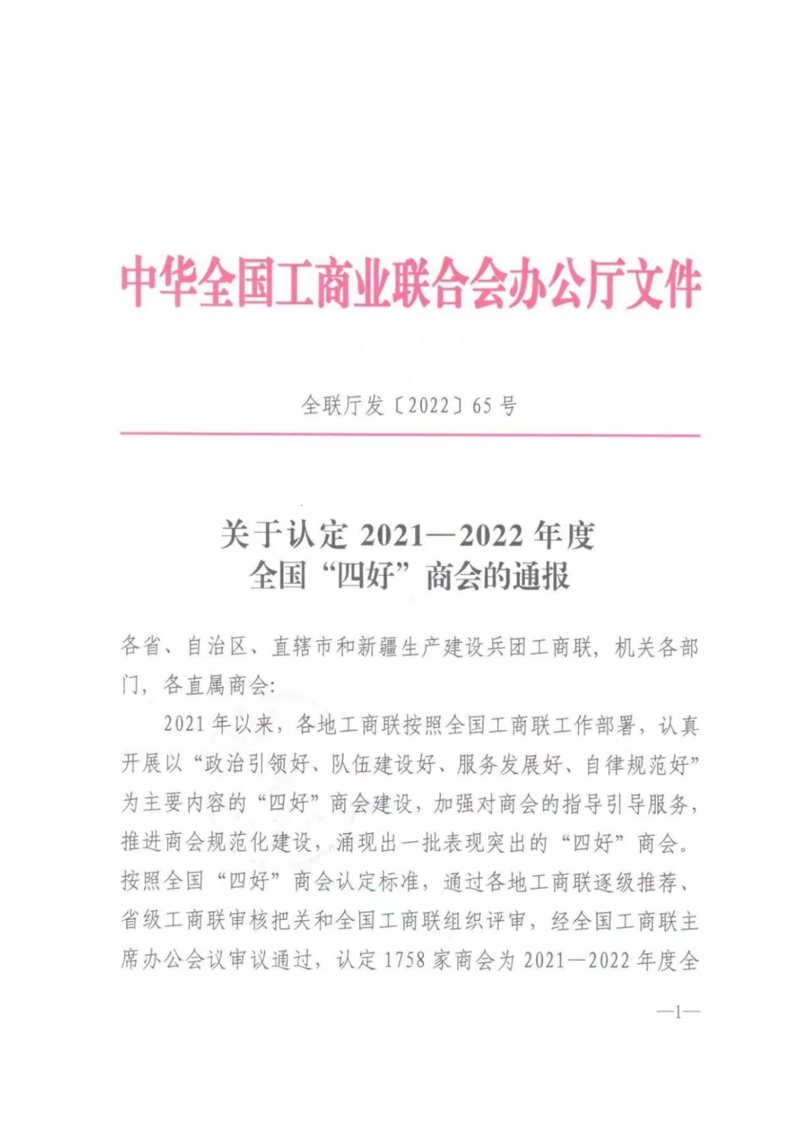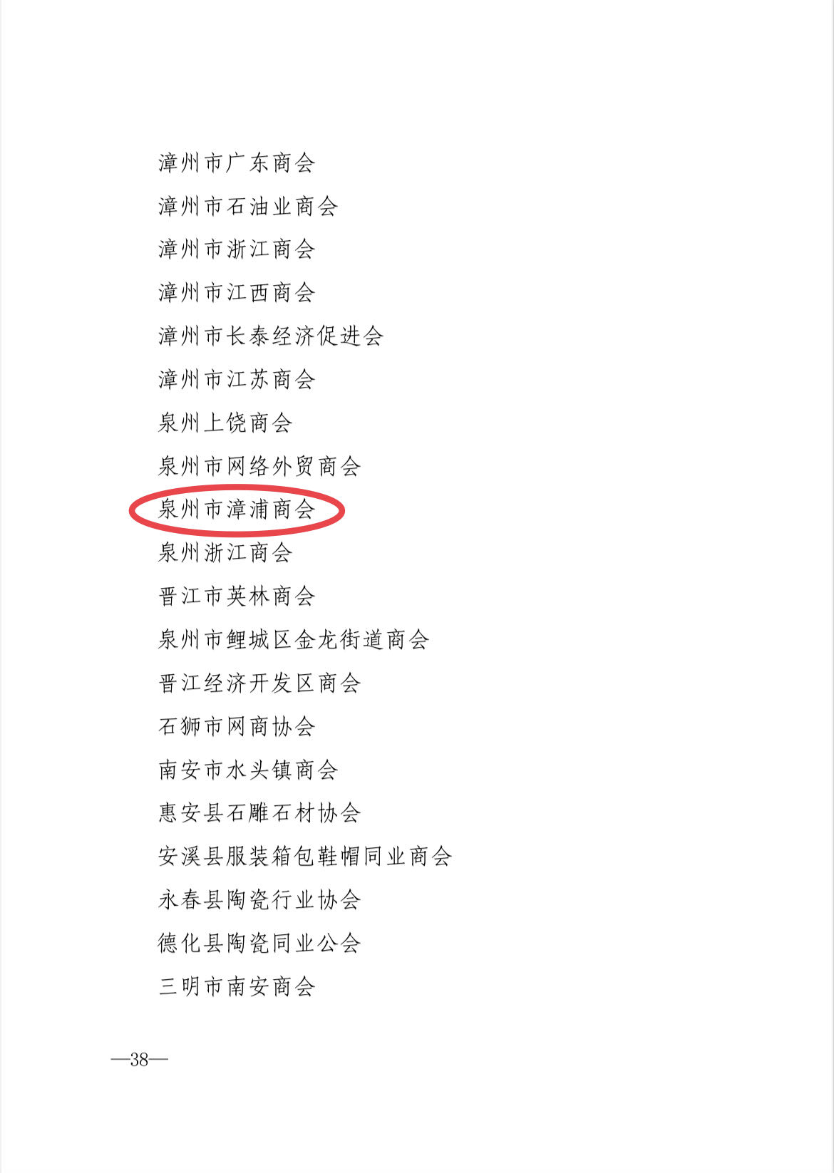 获悉中华全国工商业联合会办公厅2022年11月30日全联厅发[2022] 65号关于认定2021—2022年度全国“四好”商会的通报,泉州市漳浦商会列入名榜。