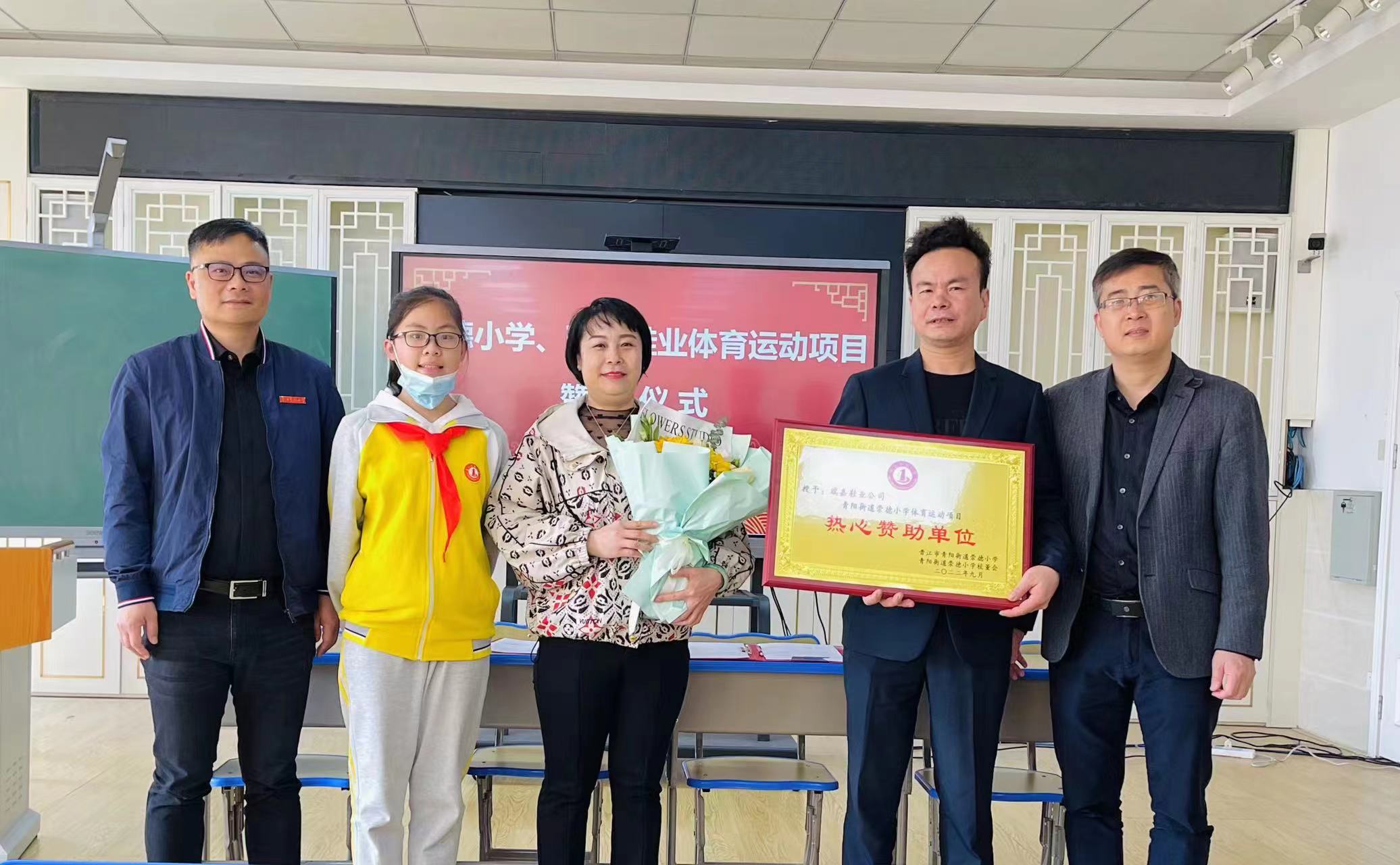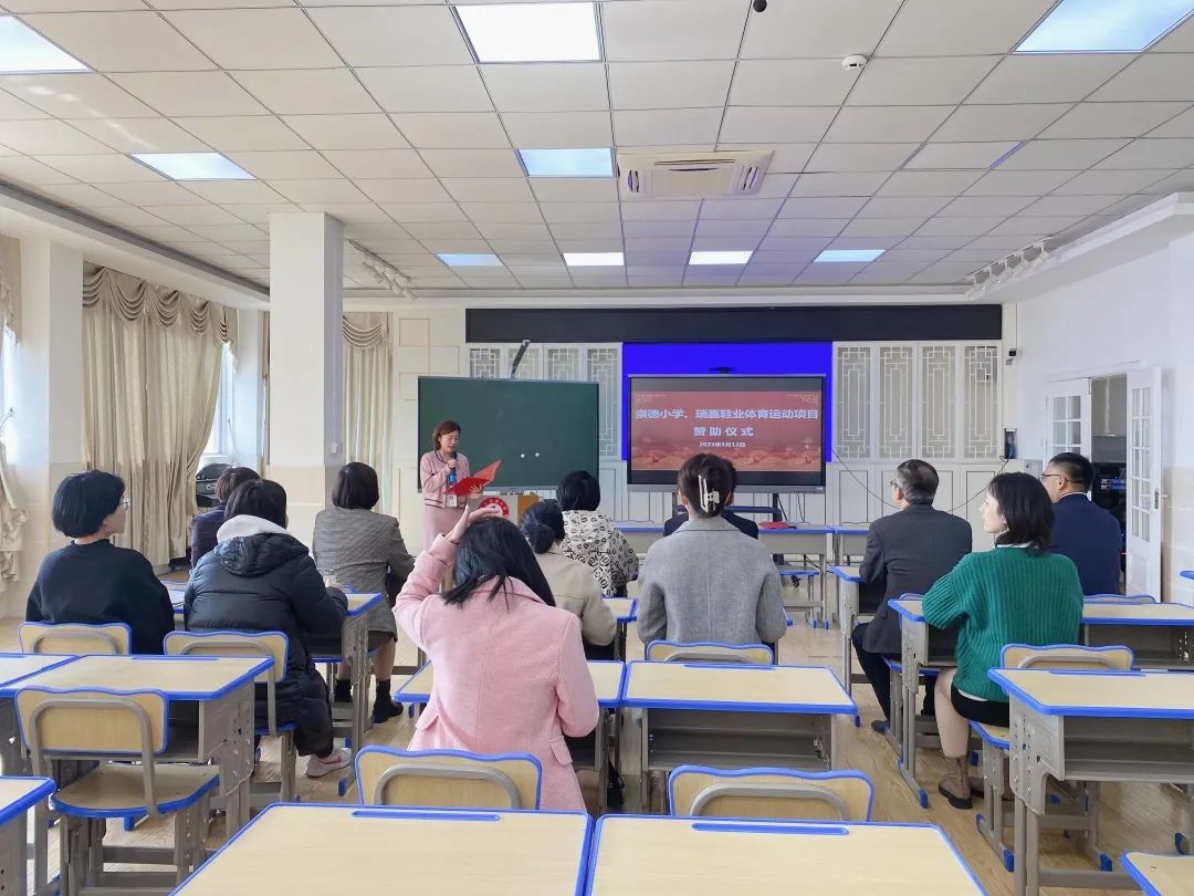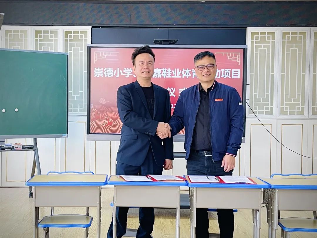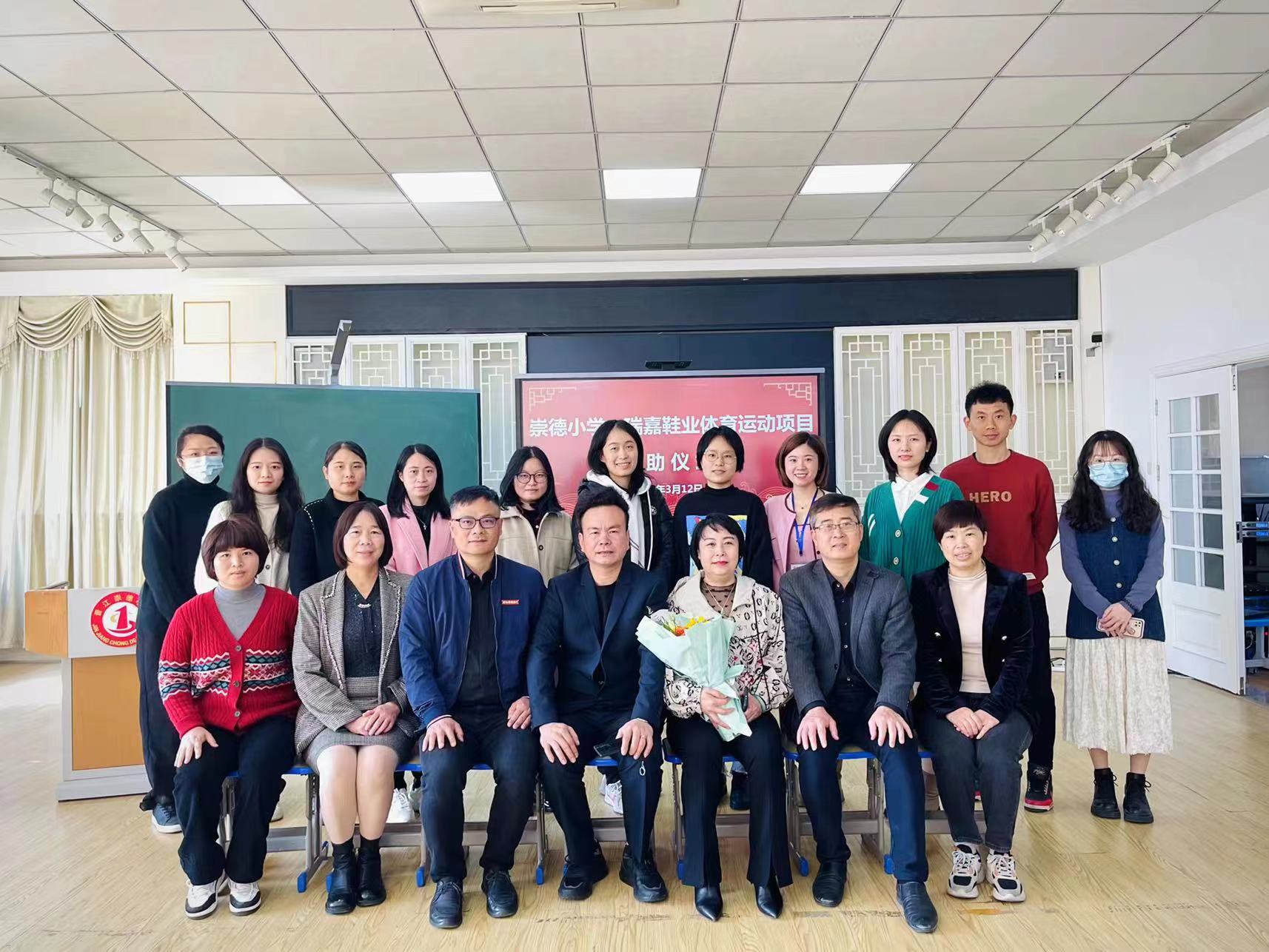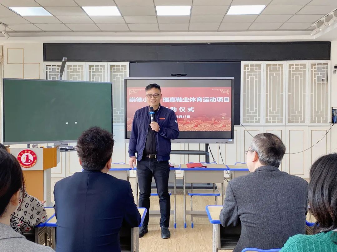 为了进一步推动该校花样跳绳、篮球、乒乓球、田径等体育运动项目的发展,陈瑞明以瑞嘉鞋业有限公司名义和崇德小学签约每年赞助3万元。在举行签约仪式上,青阳街道教育办王明溪主任为瑞嘉鞋业公司赞助授牌,优秀学生代表为刘女士献花。曾校长对两位企业家心系教育事业表示衷心的感谢,希望在双方的共同努力下,崇德小学的体育竞赛活动能再上新的台阶。